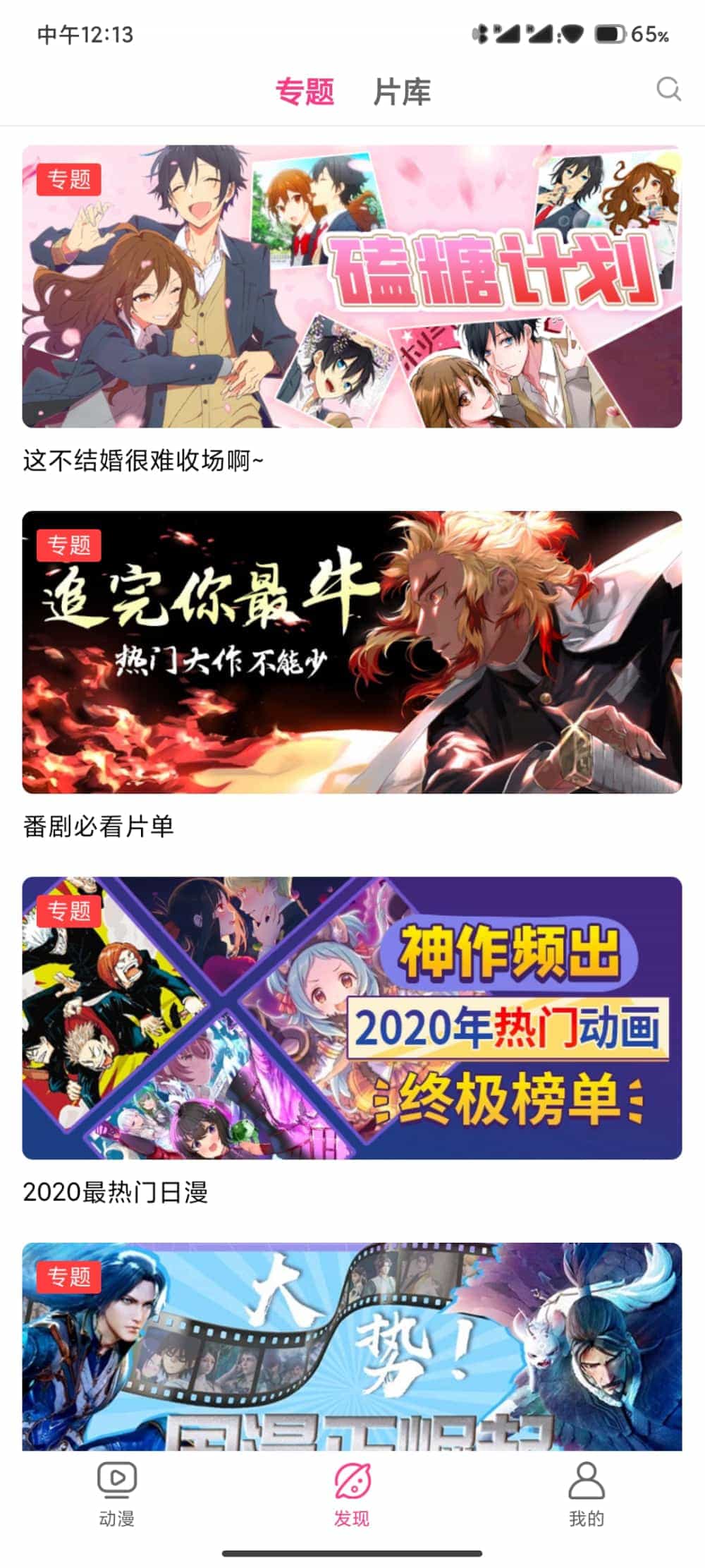 在下方的发现页面,还有专题和片库两个细分类,专题里都各种类型的动漫合集,片库里则是各种经典漫画。