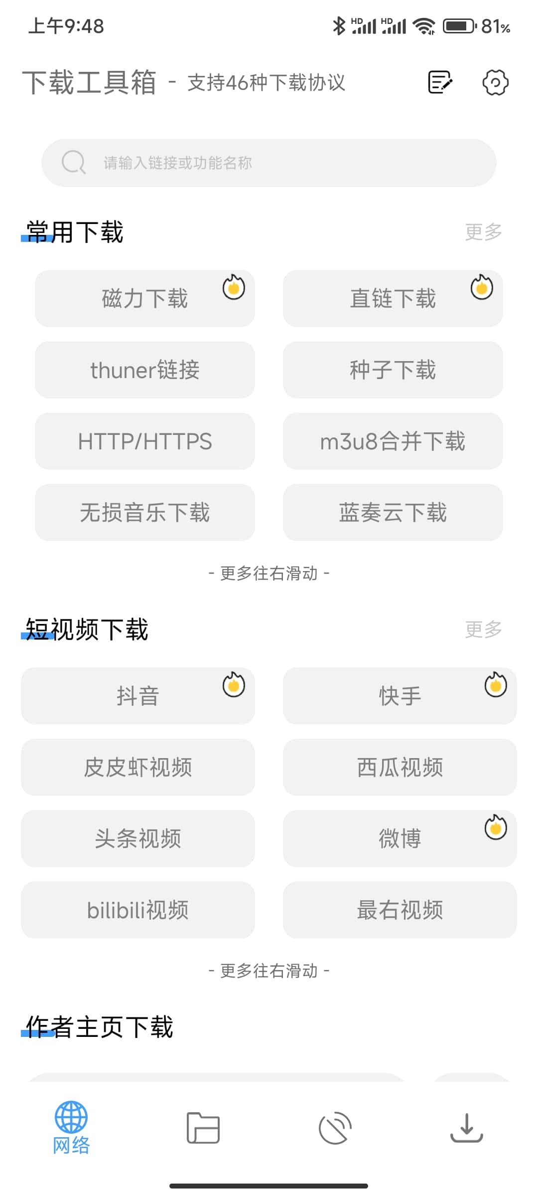 下载工具箱app是一款纯粹的全能下载器,没有除了下载以外的多余功能,所有功能完全免费。支持46种协议,磁力或迅雷链接,直链或m3u8,无损音乐下载,国内外各平台短视频下载,全部无水印保存,还支持下载淘宝京东拼多多等电商平台的商品视频图片,以及最实用的网页资源嗅探功能。
