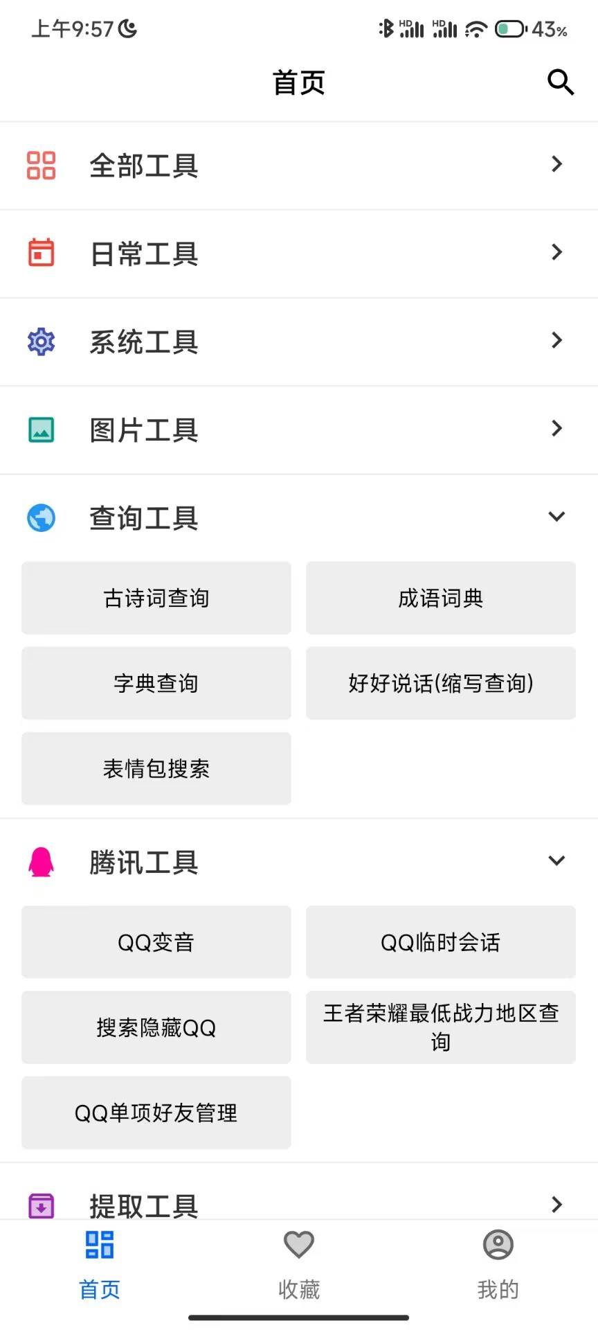 十大分类,共338个工具,如遇部分功能失效或不可用,请反馈即可。含括各种各样的工具,一个软件相当于起码十几个软件了,包括但是不限于天气、日历、计算器、影视、直播、星座、查询、图片处理、小游戏等等。