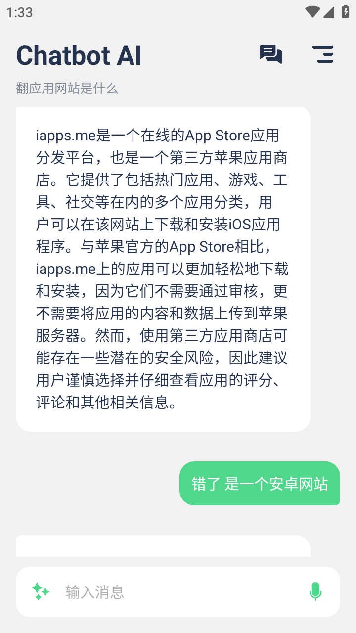 chatbot智能聊天机器人是可以和ai智能兑换的软件,聊天机器人会模仿人类对话方式聊天,您可以提出各种问题,智能机器人可以模拟揣测用户的想法来回答,还会普及很多专业知识,都是经过认证的,完全可以采纳,帮您解答疑惑,有需要的朋友们快来下载使用吧!
