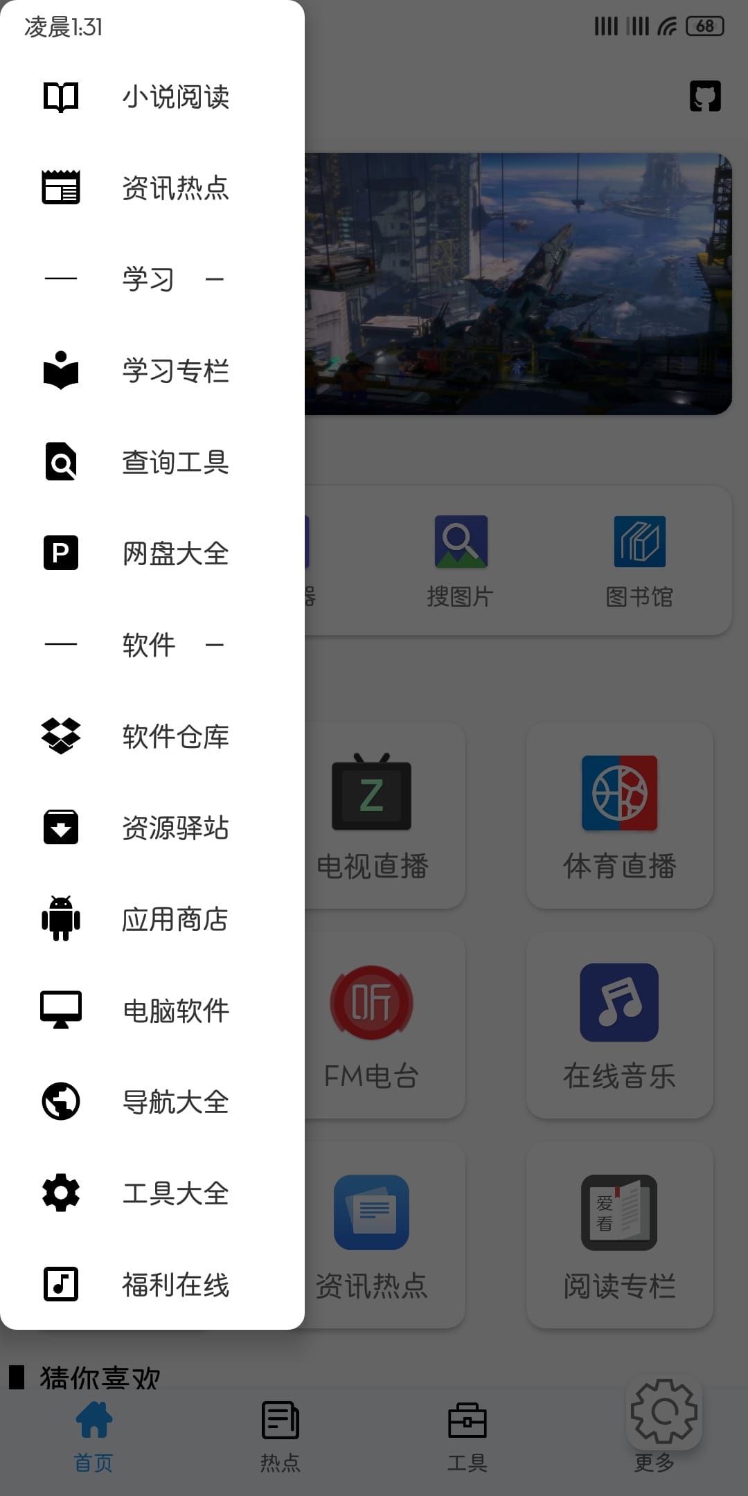 然后最大的惊喜是在你打开导航侧边栏。「资源聚合」可以说还是个手机版的网址导航,内置了超多的各种优质网站。
