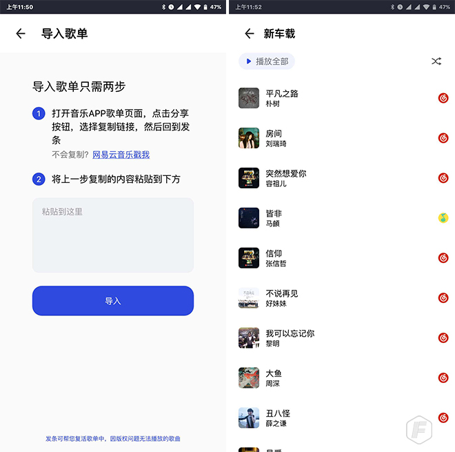 「发条」聚合了网易、qq、酷我、虾米这4家主流音乐平台, 海量音乐试听用它一个app就够了,它还可以导入歌单,把歌单里变灰的音乐“复活”。